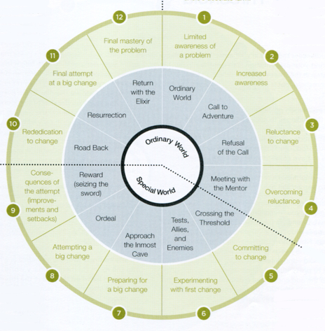 | The Hero encounters Tests, Allies, and Enemies and begins to experiment with the first bit of change. | Now the real work begins, but it’s hard. people and things oppose the effort to change. |