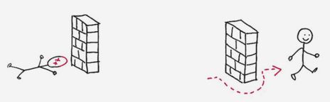 - See problems as opportunity. – We can get hung-up on the word ‘problem.’ Problems are perceived as impenetrable walls – something that gets you stuck. (Like the stick figure above). Assume a problem is a positive challenge that, with enough poking around, has a solution.
