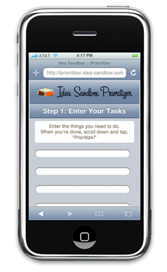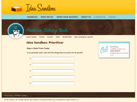 Do you have lots to do, but don’t know what do first? Get yourself in order with the Idea Sandbox: Prioritizer. FREE web-based tool! [Go To Prioritizer →]