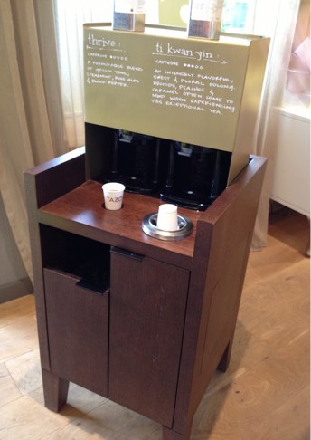 Within the Tazo Tea Store in Seattle, WA, this cart offers customers two types of tea to sample. A very smart cart as it features a space to write about the product, a place to display the product on top, disguises two thermal containers, a cup dispenser, and trash can. Brilliant!